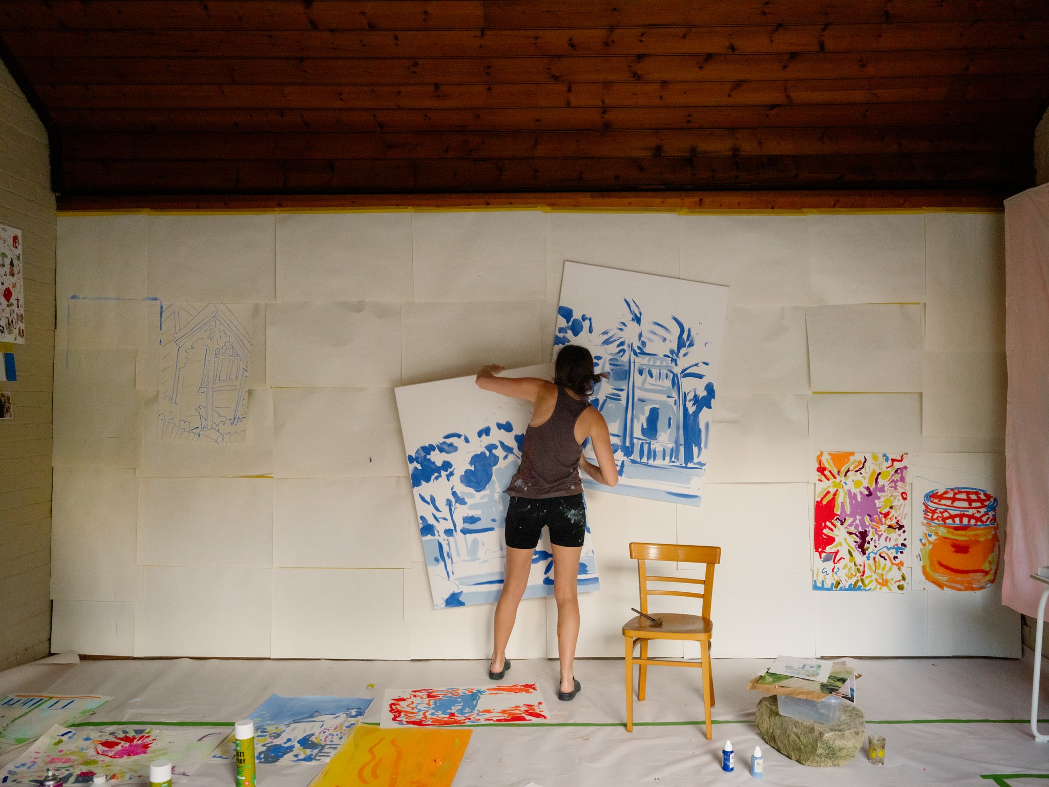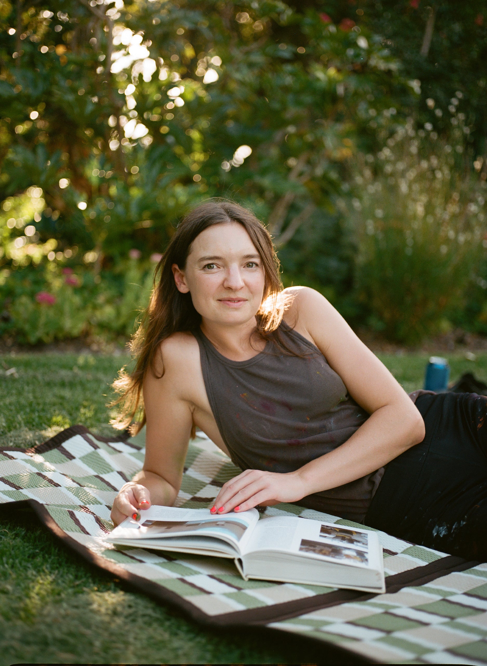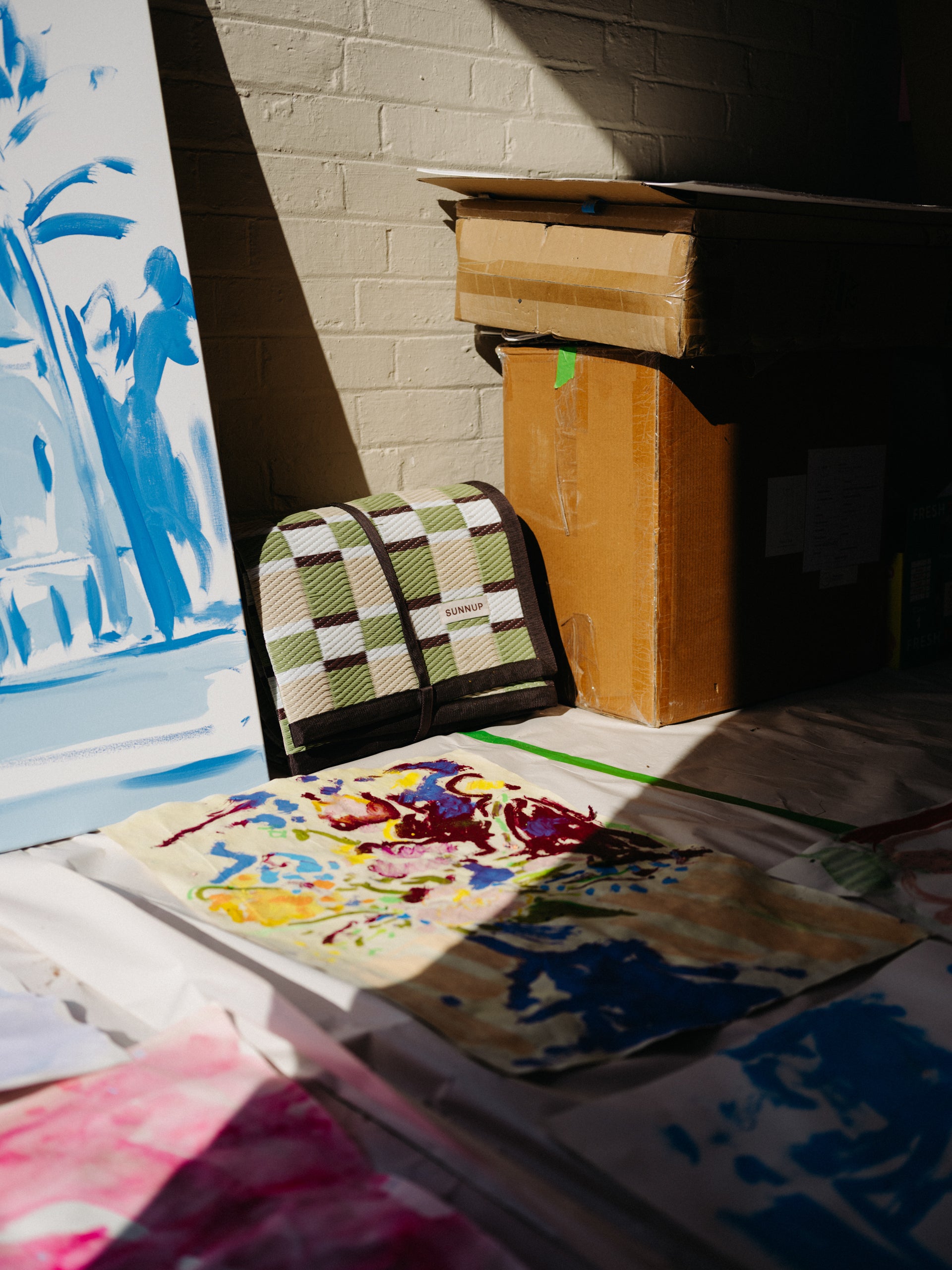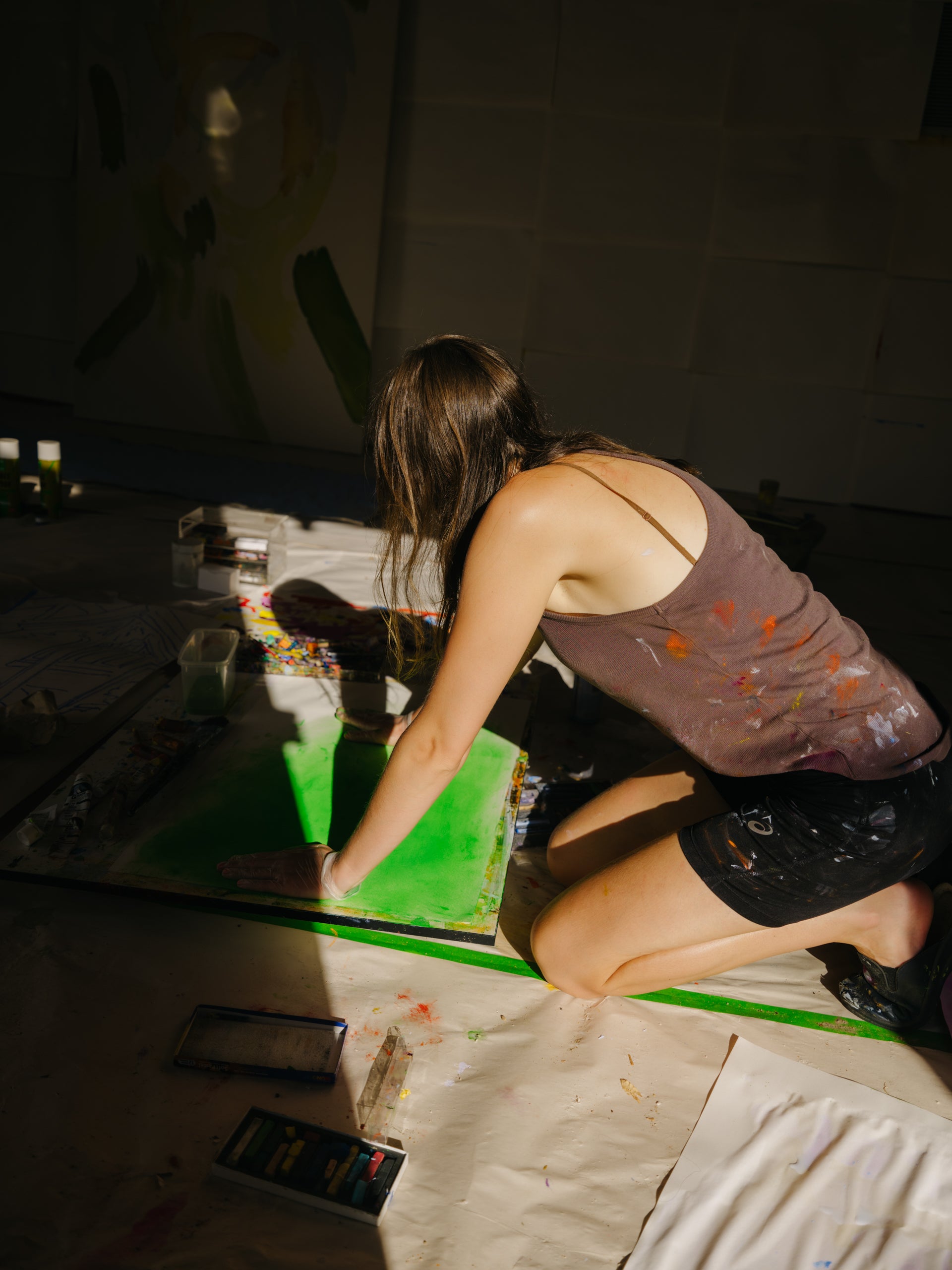 In languid interior vignettes or vast sunset gradients, her work is underpinned by a close attention to sunlight, and a faithful devotion to colour. Looking at Evie’s work is visceral more than visual - one sense becomes a vehicle for the whole body. It has the feeling of plunging into an icy rock pool, falling asleep in the sun - warm, expansive, as familiar as it is transportive. The paintings feel like summer, so it makes sense that we caught up towards the end of a long week of high-thirties days to bask in the sun, and watch the sky change.